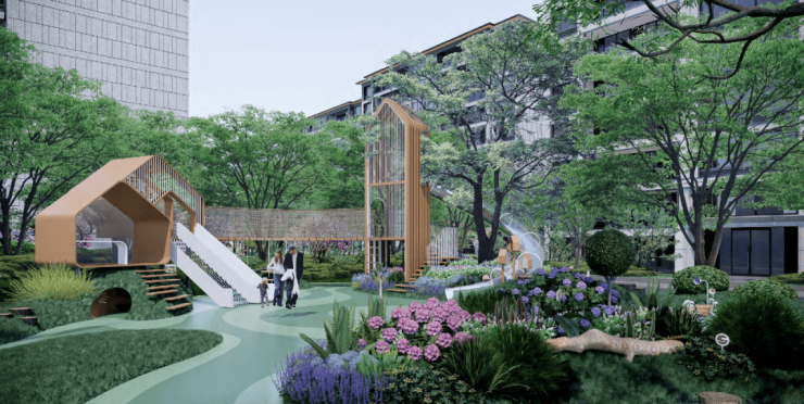 秉承于此,中国铁建·花语天著颠覆传统“中央景观+组团景观”的打造模式,创新推出“自然空间平权主义”的理念,将下沉花园、中心会客厅、阳光草坪和儿童乐园等景观空间巧妙规划于各个建筑之间。