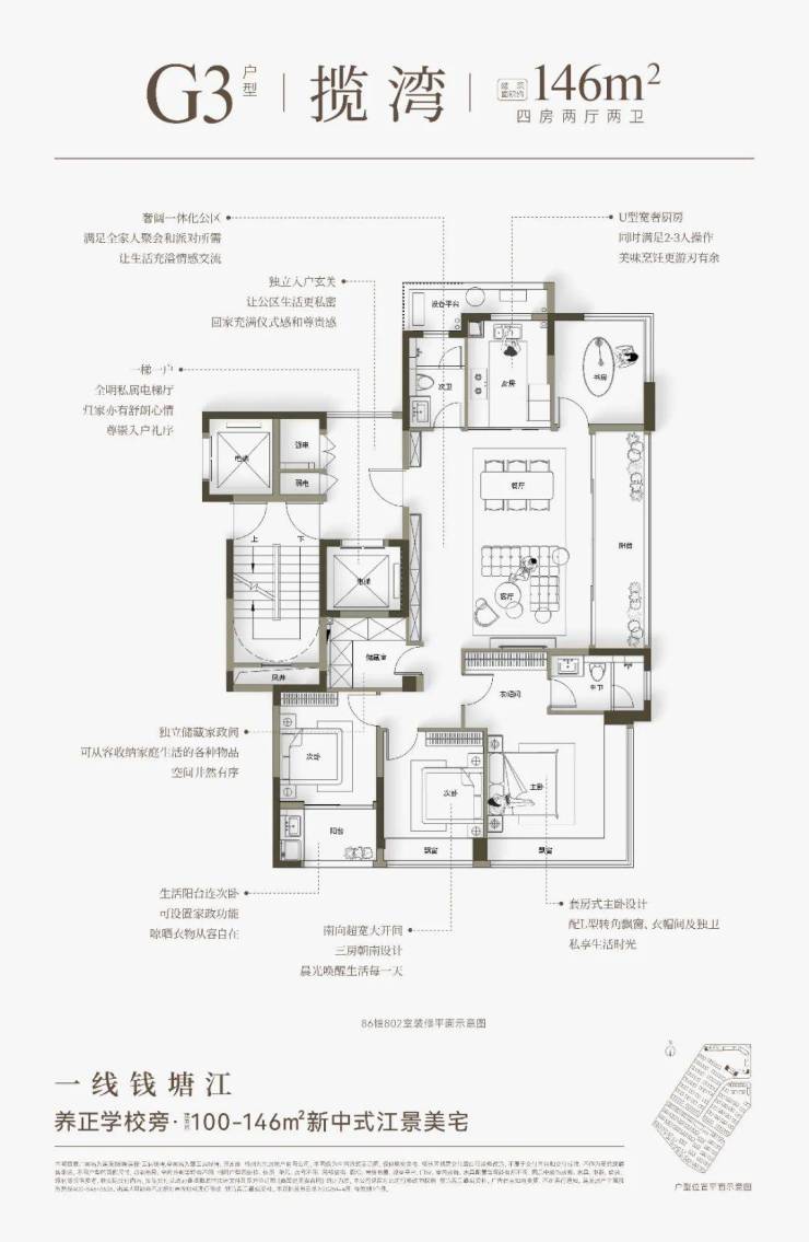 云启钱湾高层分为4种类型,建面约100㎡和建面约121㎡户型,做了创新S墙设计,提高了空间利用率,对年轻家庭来说,也是非常友好的。建面约146㎡四房户型,全部南向面江,大部分楼层还可看到一线江景。