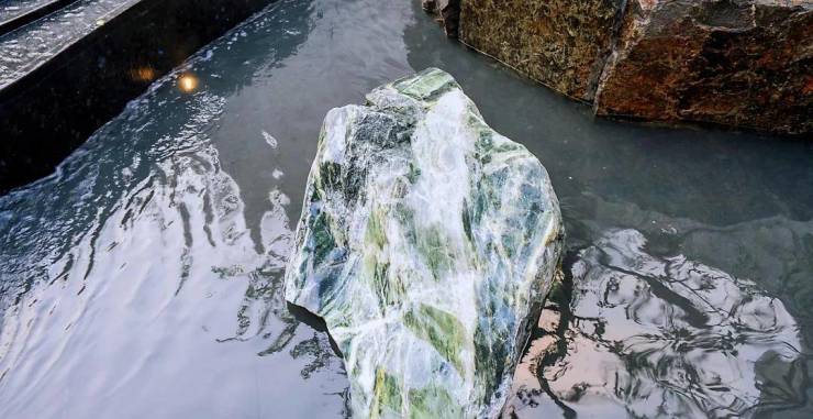在「玉扣绿岛」庭院里,有着七千年历史的中华四大美玉之一的「独山玉」与山川溪谷互映光华