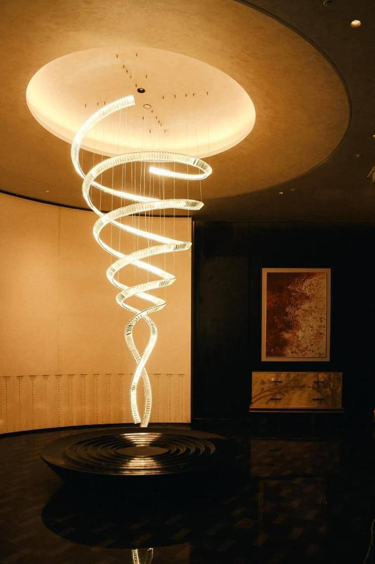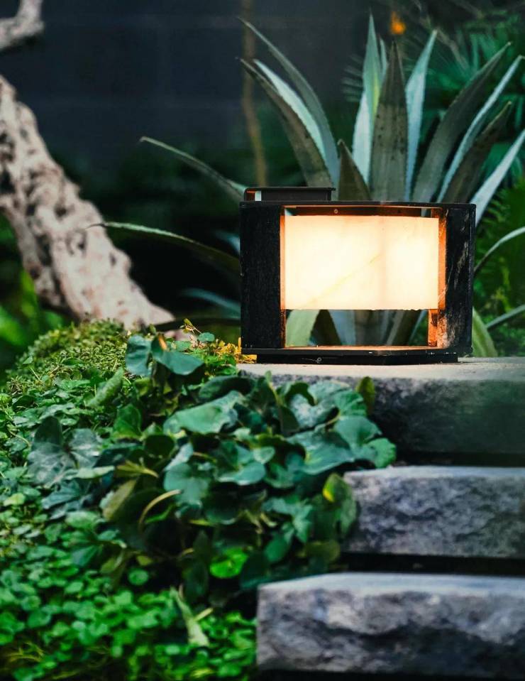 入口阶梯的左右两端的景观灯具,由伊朗奢石“白雪公主”打造,石体历经1.3亿年沉淀,灯光通透,雪色中鎏金细纹交织,如同写意山水画中的留白与流