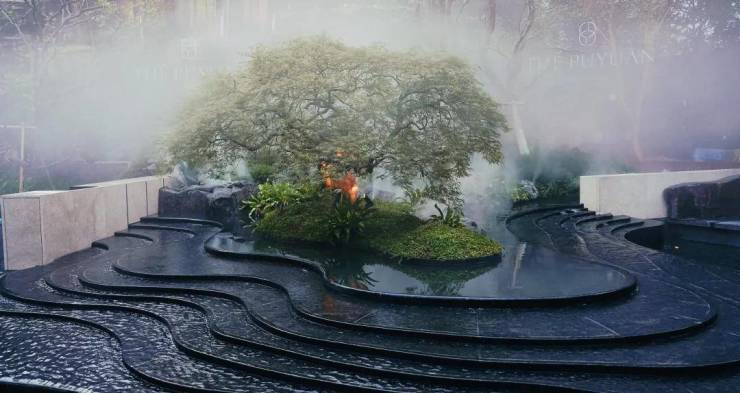 落客区水景底部,铺陈着巴西银河金奢石,深邃的黑色底板上,金色纹理自然随机分布,宛若一条被珍藏的微缩星河