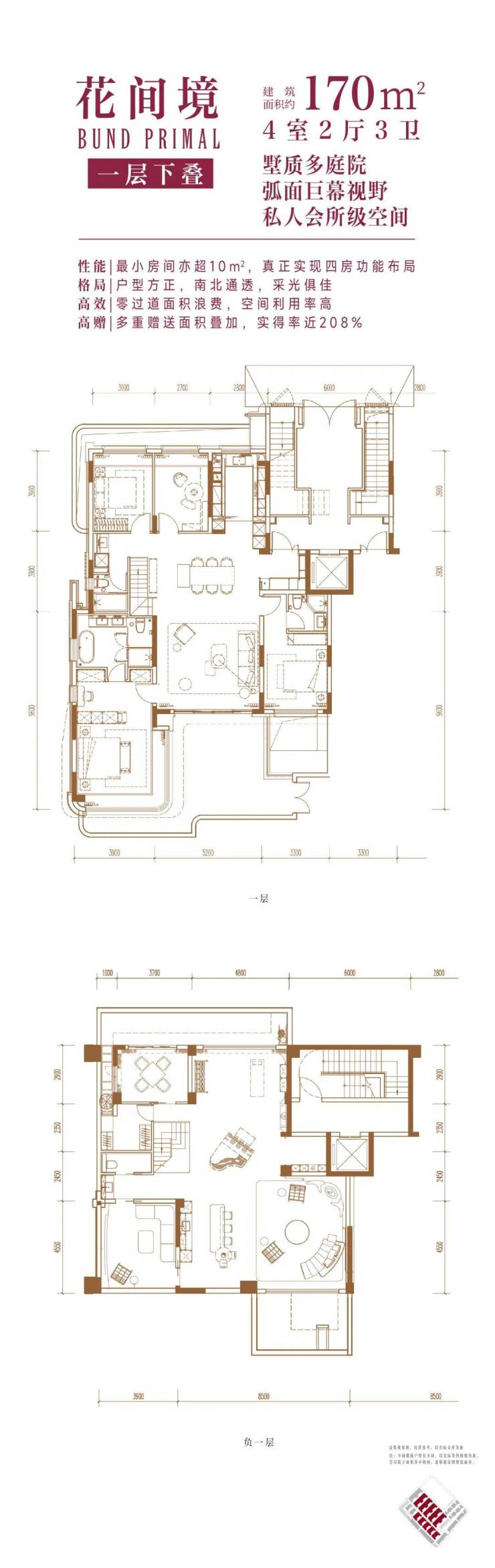 从内部空间体系来看,地上三层,层高分别是3.6米、3.3米和3.3米;每个单元一梯两户,每户均拥有类独立电梯厅;一楼带地下室及庭院,并通过创新退台式设计为二楼和三楼打造私家空中花园,形成户户有花园的墅居生活方式。