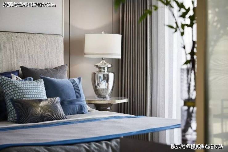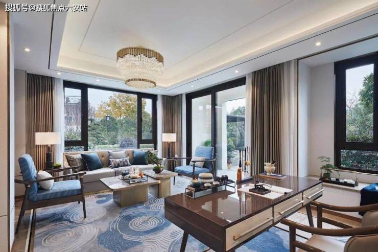 走入空间,可见水纹的柔美点染于软包、画饰、地毯等软装上,渲染出怡人舒适的空间氛围。三扇大面积玻璃门窗,将四时风光纳入框景中,邀人坐看自然的生机、时间的足痕。