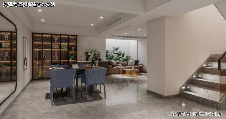 步入地下一层,餐厅与客厅相通,沙发背后的竖井景观,让整个家的空气都变得通透明亮清新。家具都是沉稳的咖色系,给居者一种舒适高级的感受,打开通顶展示柜中的灯,亮度和氛围直接拉满,让空间看起来更加的质感大气。