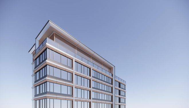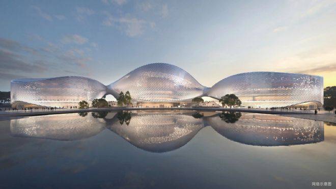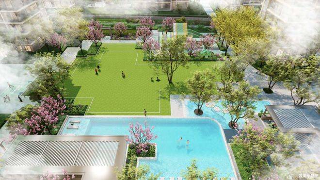 含户外泳池、下沉式会所、儿童活动区等,外立面采用大面积玻璃+铝板。