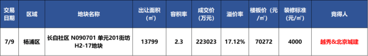 去年7月9日,上海第三批次土拍中,北京城建与越秀地产组成的联合体以高达22.3亿元的价格成功竞得该地块,其成交的楼面价格定格在70272元/平方米,溢价率约17.12%,装修标准预估不低于4000元/㎡。