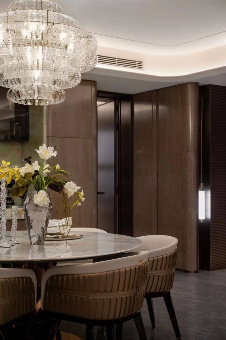 更难的是,玖著云庭还在这其中做出了层次感:比如增加了全屋无主灯的设计,圆弧形的吊顶,并勾勒了黑色金属线条,这让工艺更复杂,但视觉上却更有设计感。