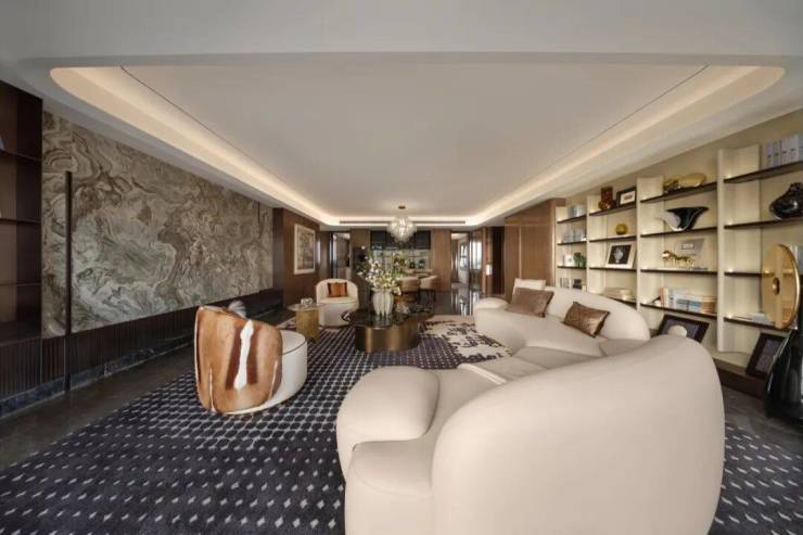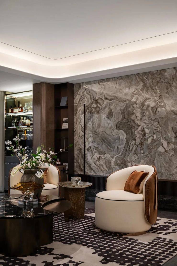 室内软装家具上,选用了真皮,羚羊皮、木纹、奢石等自然材料追求自然本真;同时又有瓦楞夹丝玻璃、镜面茶色金属等现代材料的加入……木质的温润、金属的硬朗、石材的贵气和皮料的奢华,在这里完美融合。