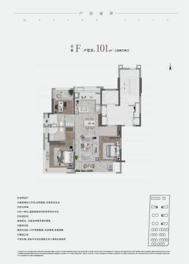 LDK客餐厨一体、在百平户型段引入南向双联阳台与独立功能阳台,主卧配置270°的L型环景飘窗,年轻小夫妻居住首选!