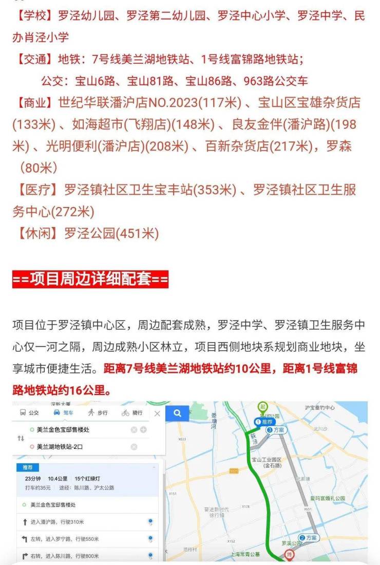 项目位于罗泾镇中心区,周边配套成熟,罗泾中学、罗泾镇卫生服务中心仅一河之隔,周边成熟小区林立,项目西侧地块系规划商业地块,坐享城市便捷生活。10分钟内接驳轨道交通7号线美兰湖站及1号线富锦路站,尽享成熟便捷交通,出行无忧。