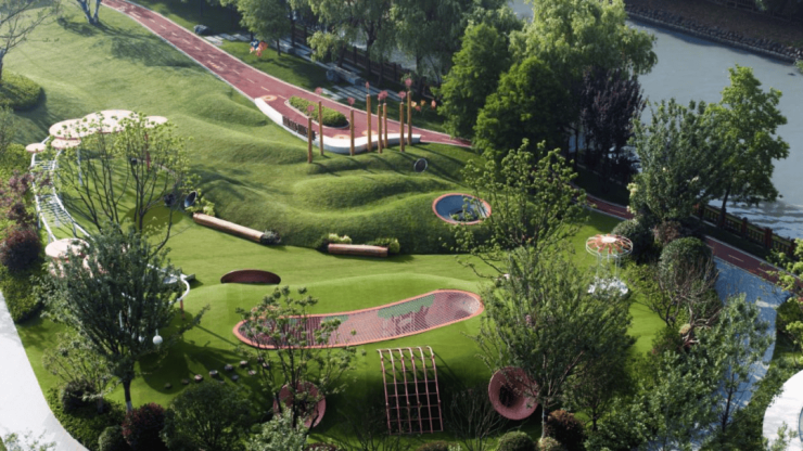 约14万方潮玩艺术公园,涵盖约2600米的滨水悦跑道、约1300㎡潮玩滑板公园、超2100㎡滨水阳光草坪、网球场、小、中、青、老各种年龄层的活力运动场地。