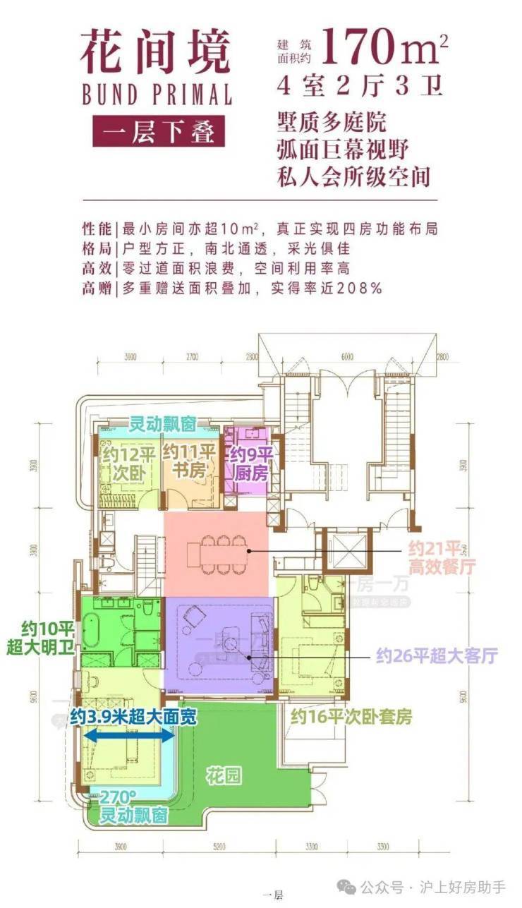以170m²的一层户型为例,单层约170平的大尺度,带来大平层般的居住舒适度(客厅面宽达5.2米)。
