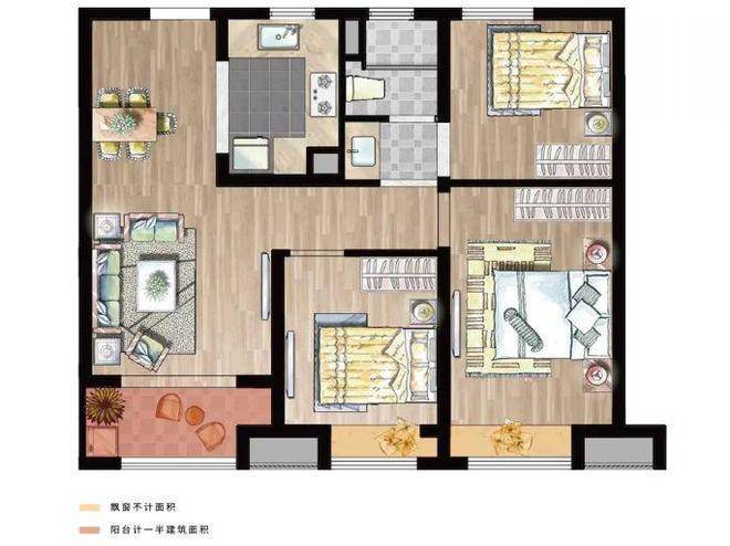 34、封闭阳台按实际面积计入建筑面积,未封闭阳台按实际面积的一半计入建筑面积