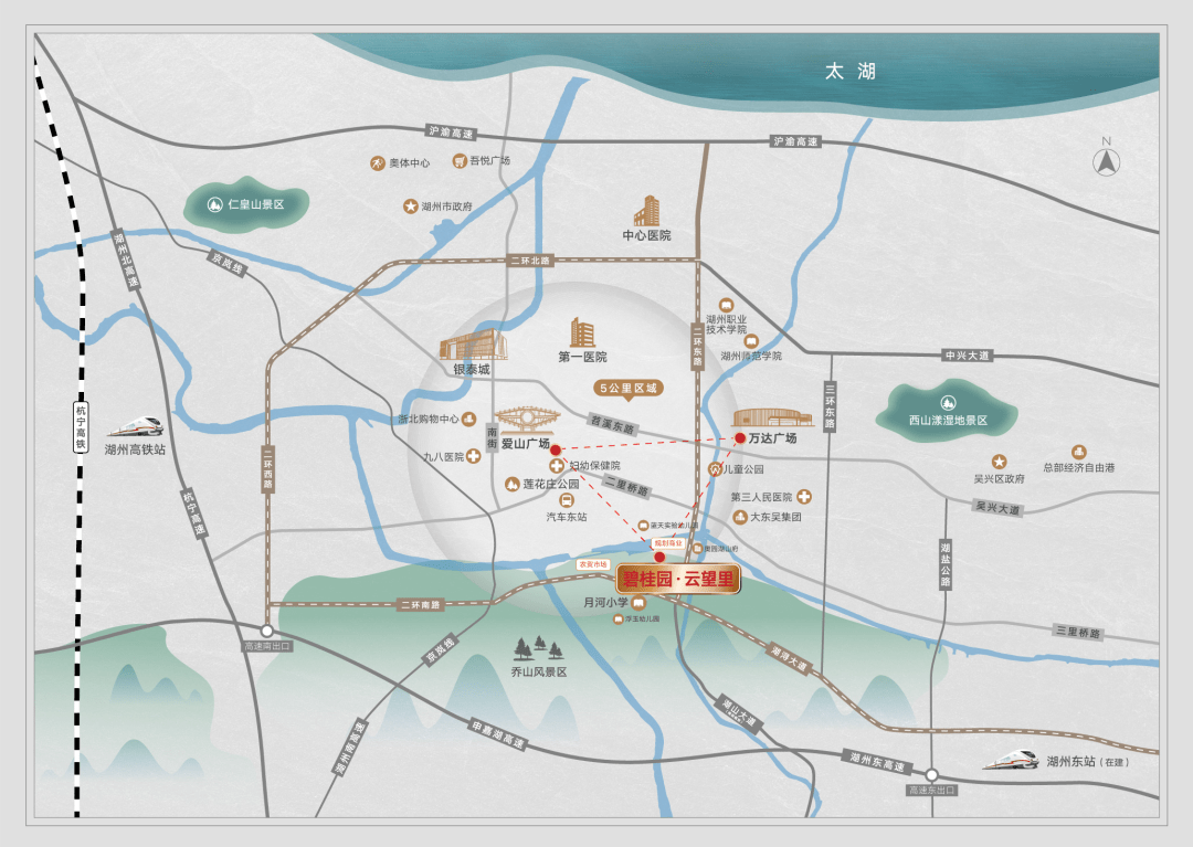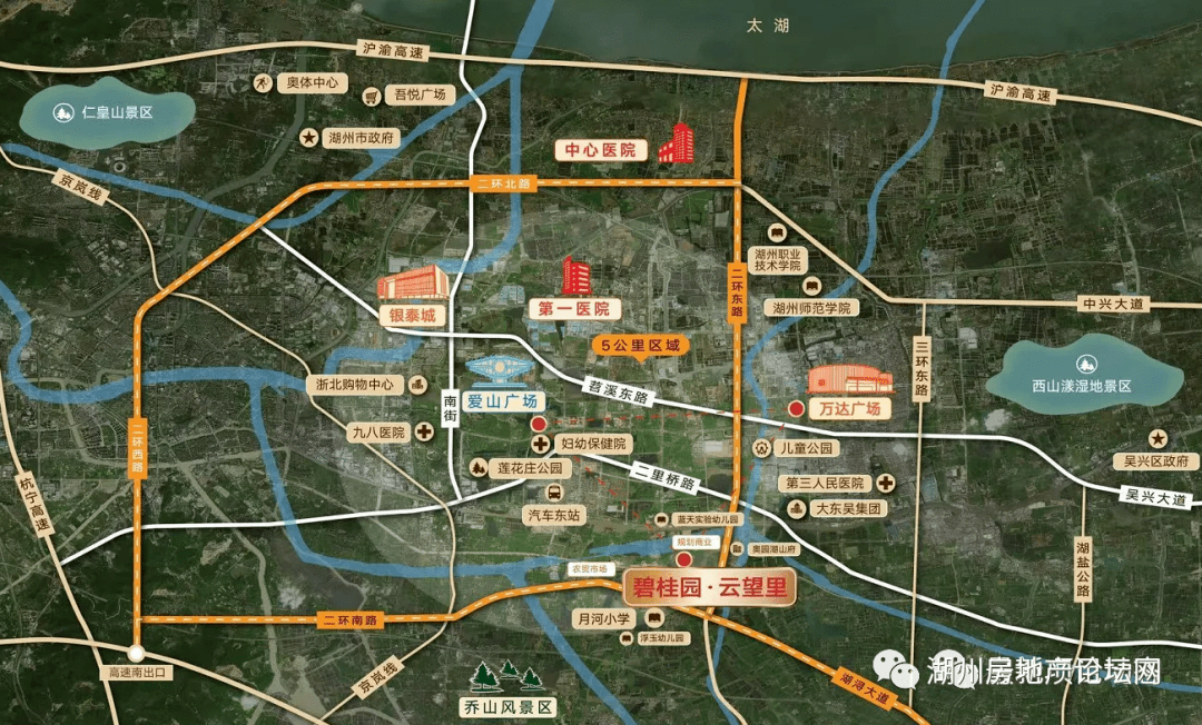 便捷交通:湖山大道、湖浔大道、申嘉湖高速、湖州汽车东站、沪苏湖高铁湖州东站。
