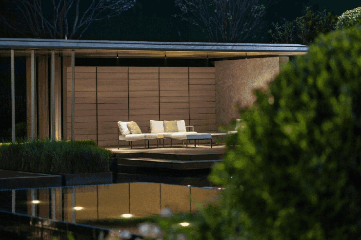·车行归家:车行归家则更具科技感与礼序感,驱车驶入湖与舍,入口道闸自动识别车牌,同时触发地库入口的“星空顶”——128种可变色LED光源在顶部形成流动星河,还会根据节日变幻出不同的颜色,营造节日的氛围感和仪式感,配合全杭州首创的“呼吸式五彩灯光”——灯光会从无人模式(亮度保持20%)逐次点亮到归家模式(亮度100%),将业主回家的礼序感拉满。更值得一提的是天阳对车库坡道的打磨,为提升项目整体品质感,特意追加成本将坡道升级为金色马蹄石铺装,不仅提升了地库质感,更增加了防滑性与耐久性。