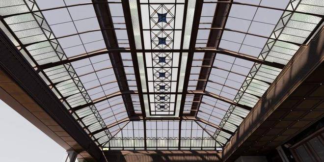 继续向里走,廊道内可见经典的石材立柱、拱形的吊顶、PRADA荣宅的手绘彩玻、繁花的地面拼花等用材工艺,移步异景间,是别样的摩登魅力。