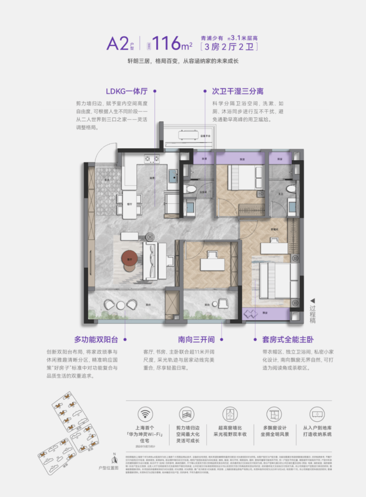 室内精装,除了采用方太厨具、德国高仪的龙头、德国唯宝的陶瓷洁具、科勒的卫浴这样的国内外一线大牌,更重磅打造上海首个华为坤灵Wi-Fi6智慧入户社区。
