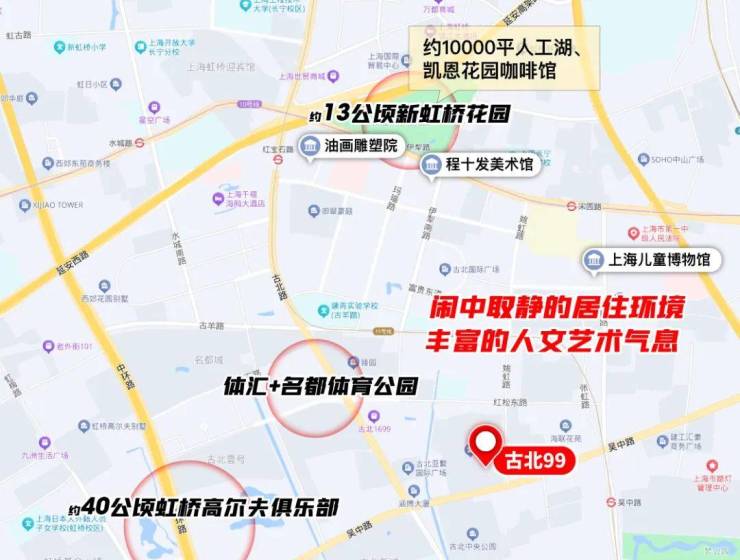 古北99地处徐汇、长宁、闵行三区交汇,内中环,优越位置,作为经贸产业核心圈唯一的高端居住板块,古北没有一江一河CBD或旅游商贸的嘈杂感,生活配套更醇熟、生活方式更“国际范儿”。古北拥有51%的外籍常住人口,27家驻沪领事机构、200多栋外交官官邸、更有6800家外资企业、近80家跨国公司地区总部……作为沪上外籍人士和高净值人士的首选聚居区,古北的国际化地位,不可撼动。