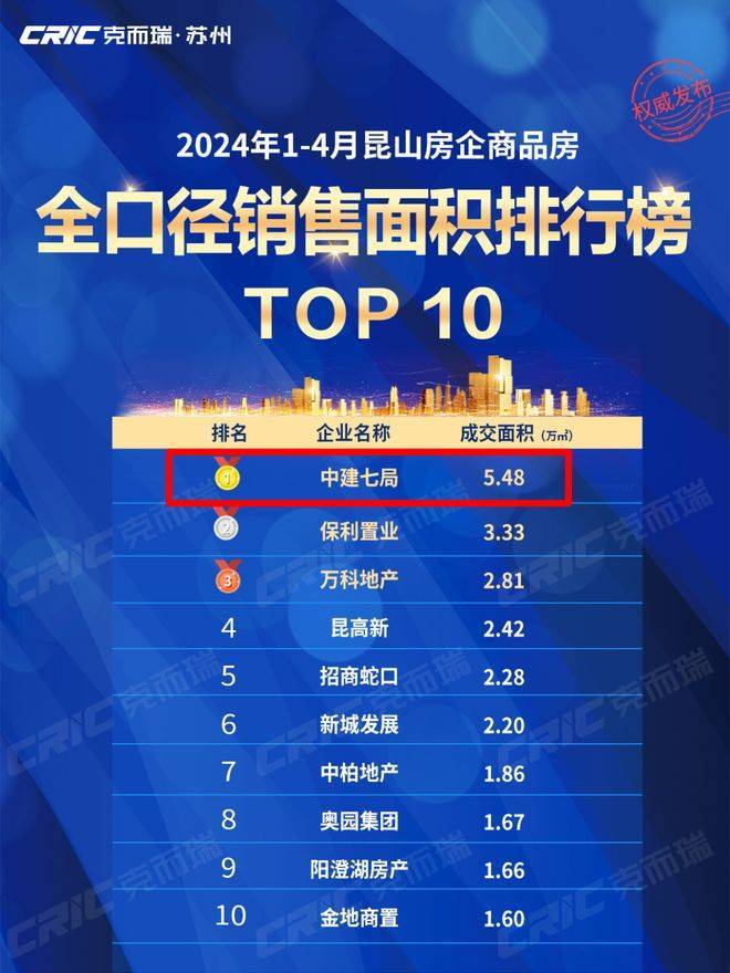 据克而瑞苏州房产测评统计,2024年1-4月,中建七局地产集团以10.97亿元、5.48万方的优异成绩,位列昆山全口径销售金额、面积双冠王!充分展现强者实力。