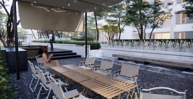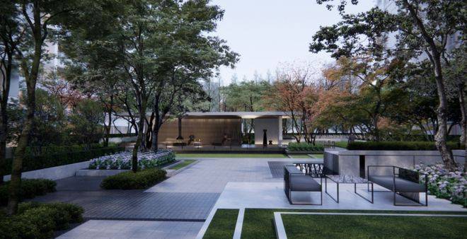 ▶绿树繁花围合的森之客厅,会是邻里喜爱的社交天地,林荫绿意之下的友邻相乐,更多一丝轻松与写意。