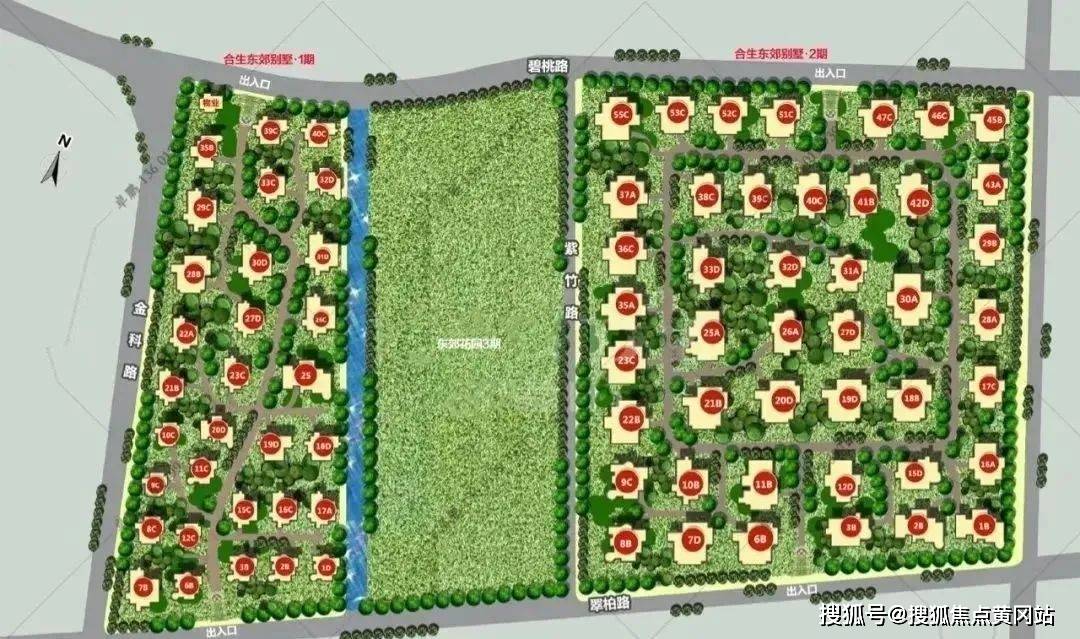 【合生东郊别墅二期】景观采用内外双景观设计,外景观采用十字景观轴设计,在景观轴上布置有:休闲广场、林荫步道、中央水景等景观,步移景异;