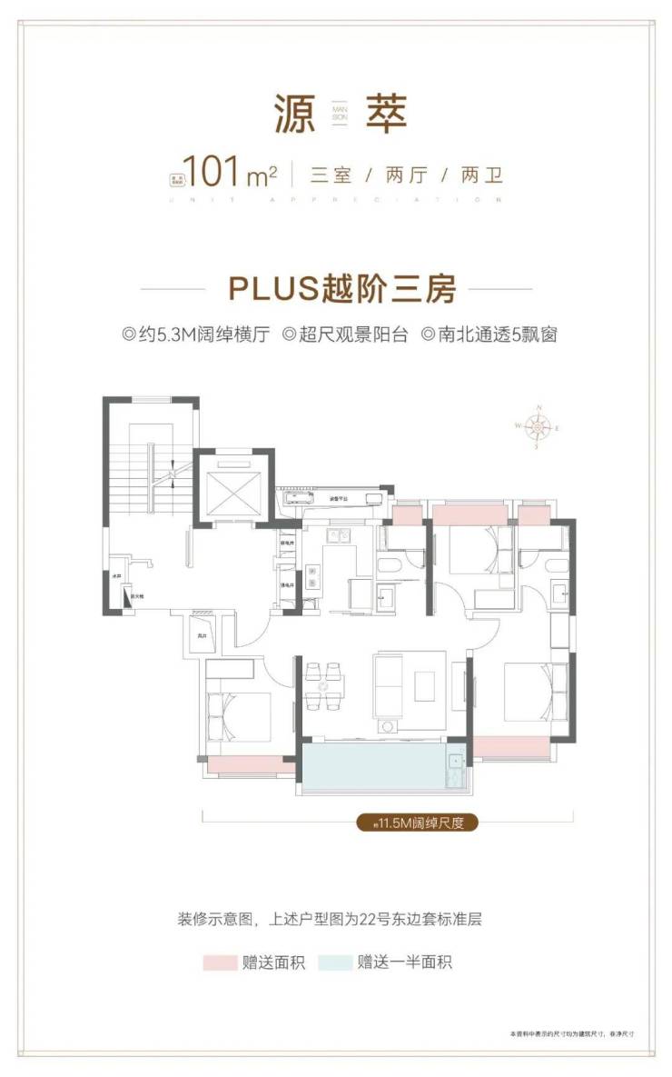经典飞机户型+三开间朝南+餐客厨一体化+约5.3m的阔绰横厅,整体南向面宽达到约11.5m!整个户型的通透度和采光度很棒。