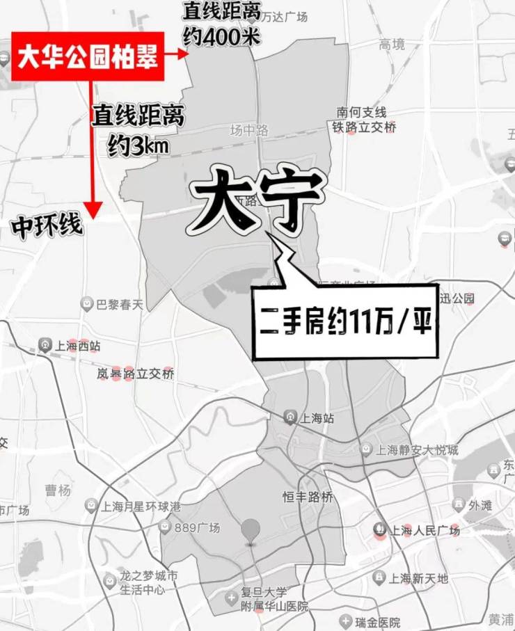 如此一来,同纬度的大华·公园柏翠成了难得一觅的存在!它的地段有多好——直线距离静安区只有400米,距离中环线3km!