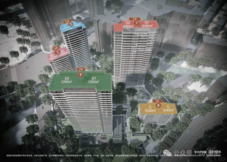 其中,2号楼和3号楼应该为双楼王,均为正南朝向百米高层,两梯两户配置。