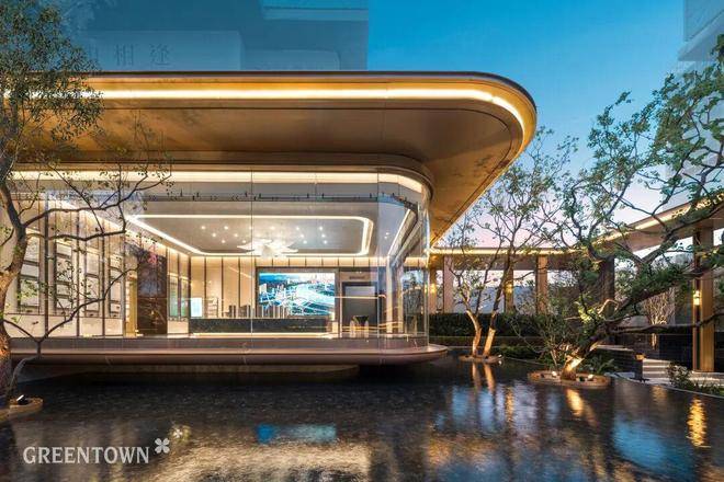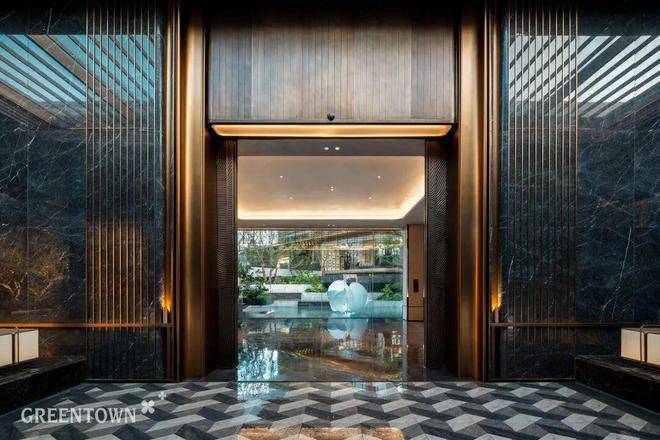 主入口知·云栖,取意西湖十景以"洄游"为理念,超52米跨度的回字形布局,重构传统"四水归堂"空间序列,约2.4米“流光礼宾”塔冠,如悬浮的美学灯塔,与金色挑檐相映成辉,全封闭式阳台勾勒建筑轮廓,让立面如镜幕般收纳约30公里江岸鎏光!