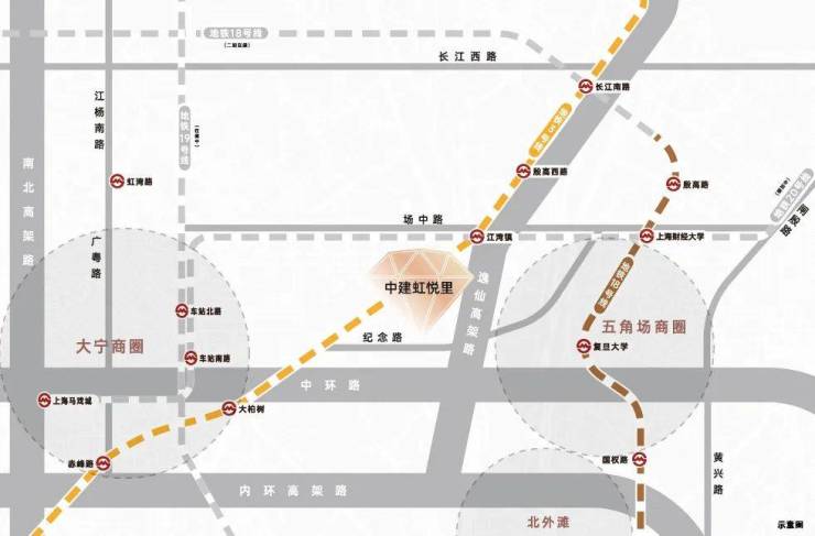 项目是真正中环旁新盘,直线距离中环仅约600米;同时这一段中环和内环紧挨着,因此中建·虹悦里直线内环也仅约1.2公里;此外,东侧还邻近逸仙高架路。