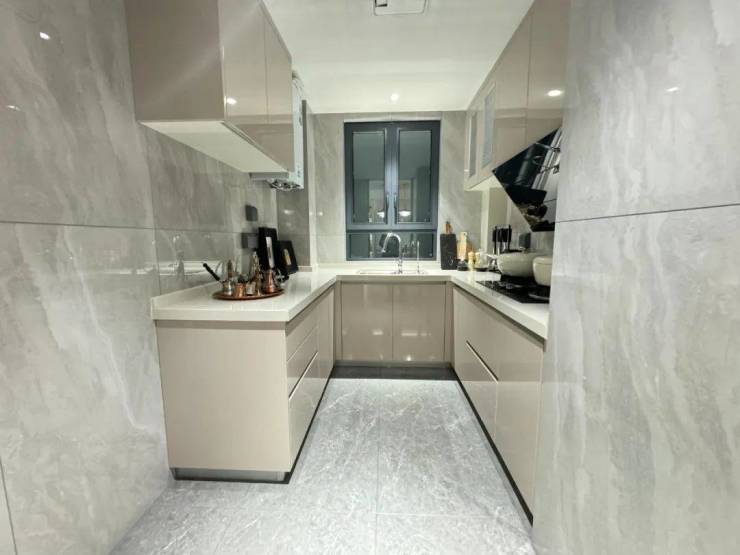 厨房在U型台面的基础上还预留双开门冰箱位,这点很难得,市面上很多99㎡户型放不下双开门冰箱。
