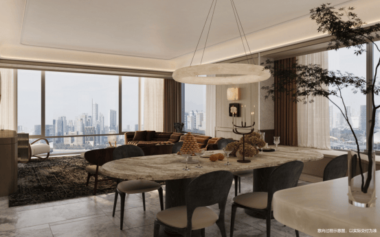 226㎡四房两厅四卫全明格局,以「南向三卧+蝴蝶灵动线」重构空间美学——三间卧室皆朝南纳光,主卧更以270°无柱转角巨幕,将江景化作流动的油画;