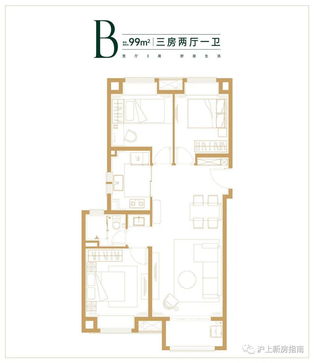 建面约99㎡三房两厅一卫