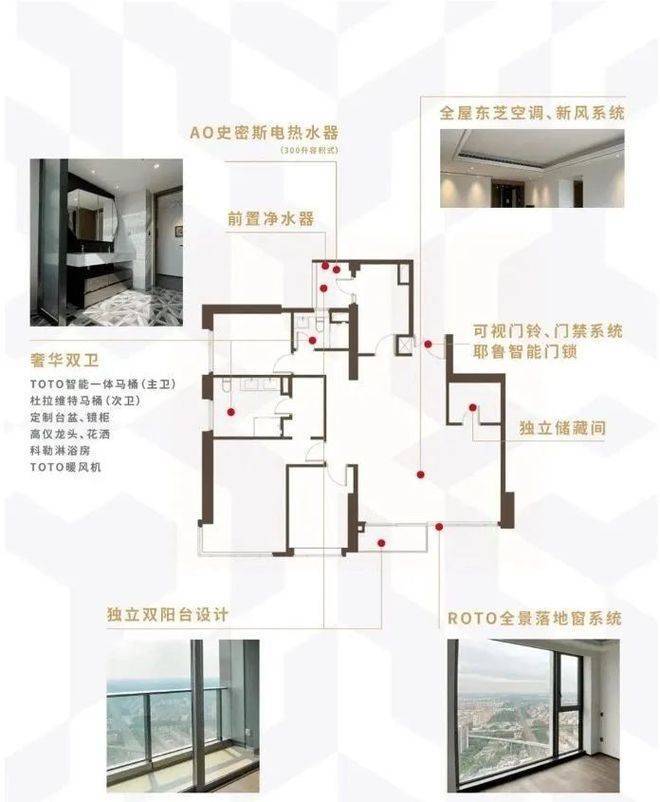 项目室内交付配备独立中央空调、新风、落地窗、独立卫生间、智能入户门。