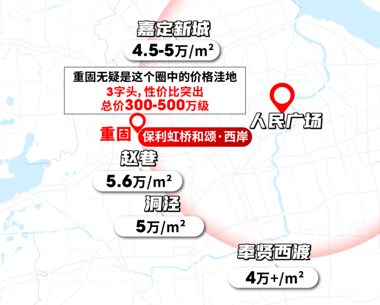 若以市中心为圆心,重固与赵巷、洞泾处于同一半径范围内,但后者房价已达5-5.6万/㎡,而重固仅3字头
