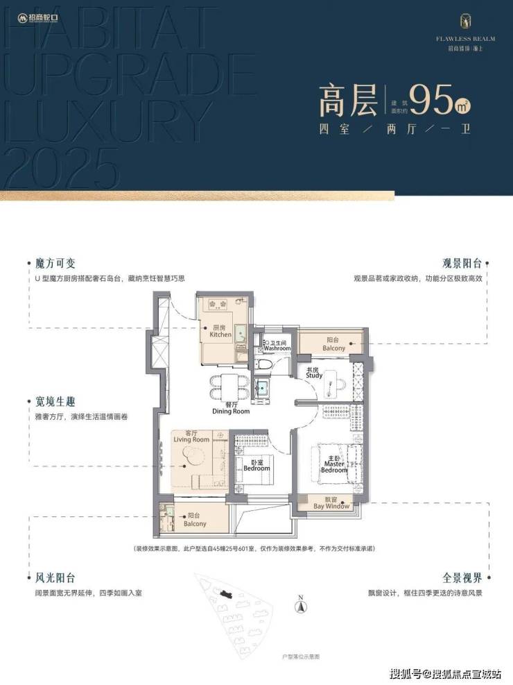 再加上南向大面宽短进深、全卧飘窗、L型转角阳台设计,哪怕小户型95㎡3房,尺度感都超棒,采光和视野更是一流。