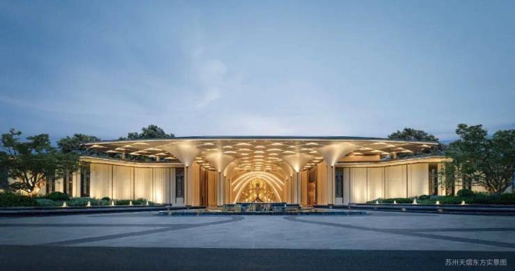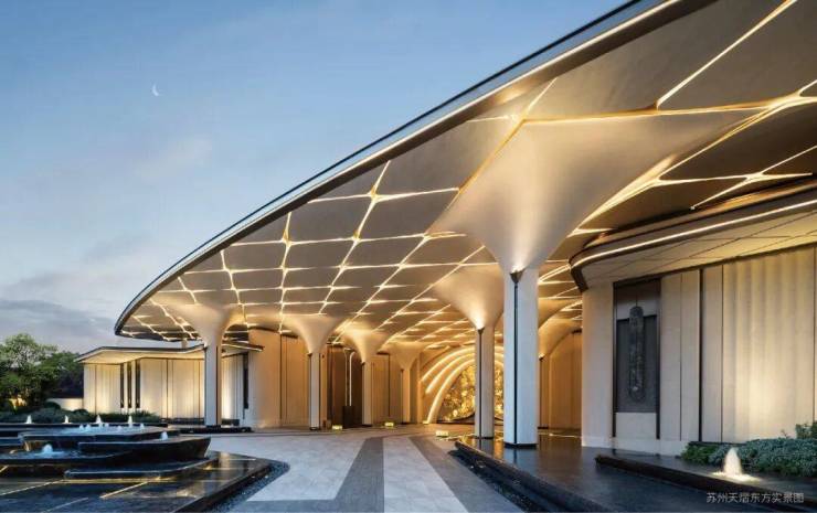 主入口设计灵感源自苏州留园经典折廊形制,匠心打造约44米超长景观界面。以现代手法转译千年造园智慧,将山水意境徐徐铺陈。远观如展开的手卷,近赏则见飞檐与格栅在光影中演绎当代版的移步换景。