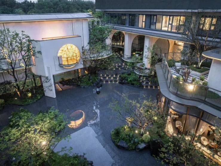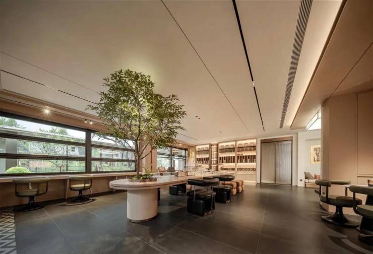 多功能会客厅,在功能上与其他会客区、架空层区分,以“林下剧场”为灵感,通过通透开放的设计,让自然光影自由渗透与周边环境浑然相融,营造出沉浸式的自然体验。