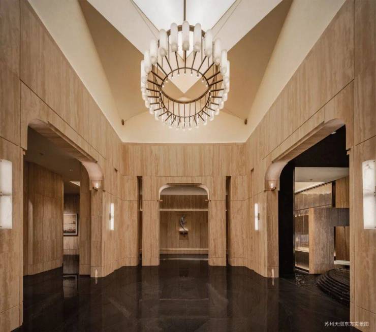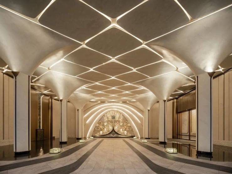 坡道采用柱廊阵列造型,阵列间穿插铺设透光云石,搭配智能化灯光控制原则,灯光车行随亮。门楣处以奢石点缀,营造出星级酒店般的豪华感。入门有“迎宾毯”光厅引导,车马厅以腕表解构布局搭配掐丝珐琅地面,每个细节都彰显奢华。