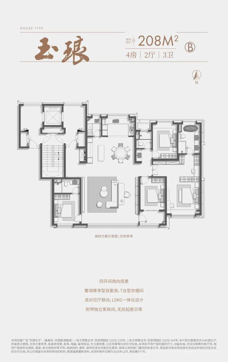 主力户型为建筑面积约208㎡四房,采用类一梯一户设计,强调居住私密性。该户型实现约16.9米南向面宽、近80㎡的LDKG一体化厅区,并设置独立家政间与全龄段套房,兼顾社交接待与家庭起居需求。