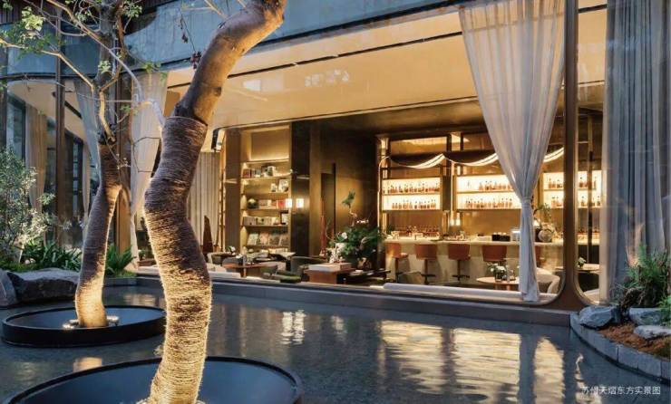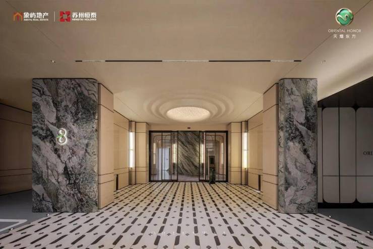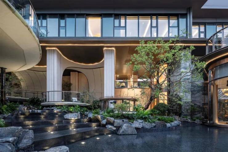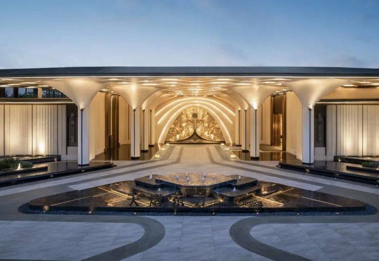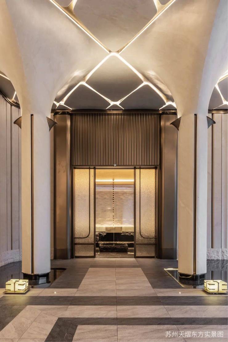 约44米玉阙迎辉主入口,结合潘多拉奢石与红果冬青,营造归家仪式感,"八方来仪"殿堂式立柱拔地而起,弧线向上尽显望族门风永续,站在门口就能感受到扑面而来的豪门气场。