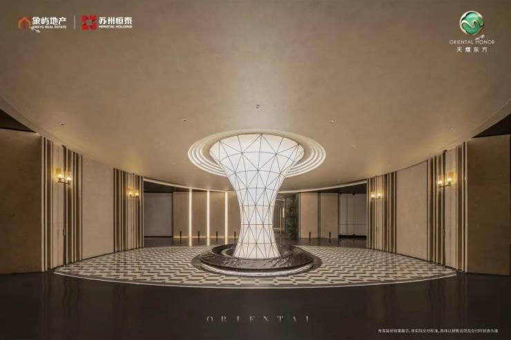 对景墙结合LOGO超级符号,甄选潘多拉星云奢石,天然晶体在光影流转间,折射出银河秘境般的璀璨光芒,营造旭日东升意象。