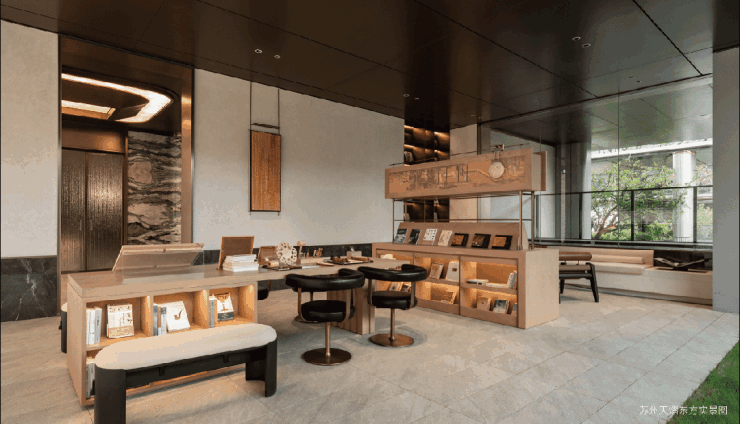 架空层除了「悦读空间」,还设置了可以作为会客接待场景的「茶座空间」,作为链接会所与样板间的延伸空间,基于生活场景化重新思考,呈现一种融合人文美学的崭新场所。