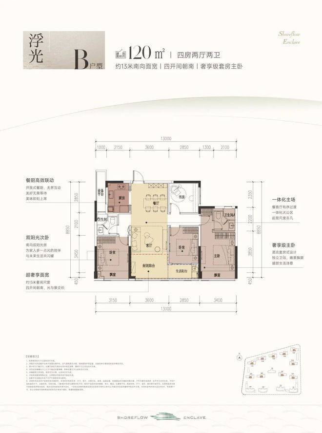 建面约120方B户型,四房两厅两卫: