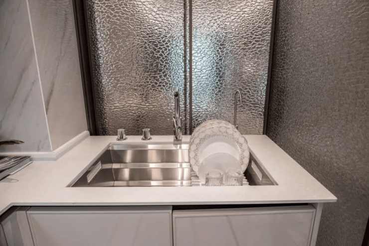 厨房方面:三面出水的科勒网红大单槽,甚至连专用沥水篮与砧板都配备上了,非常贴心,避免新产品配套无法配置的问题;