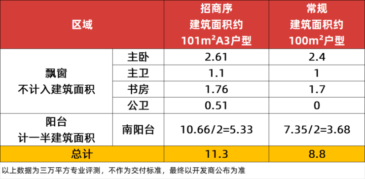 通过专业测评还可以看出招商序的不计入建筑面积的部分有整整11.3㎡,相当于多出一个房间,针对百平三房这样的紧凑型户型来说,性价比真的很高,实际居住体验也会更舒适!