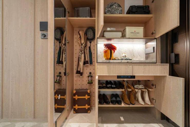 比如说玄关收纳,通过对空间的细分,预留了次净衣区、行李箱收纳、扫地机器人收纳等,增添洞洞板用以悬挂雨伞等;在鞋柜方面,底层镂空,可摆放家居拖鞋,通过隔层高低的不同划分,预留靴子收纳空间。