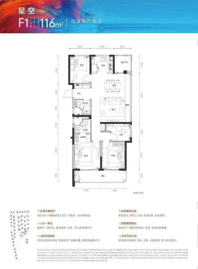 独立玄关收纳南边套房主卧带走入式衣帽间+独立卫浴+飘窗南向约6.4米面宽,带阳台,U型厨房带大开窗,餐客厅一体带约5.8米超长飘窗……该户型更具有生命力。