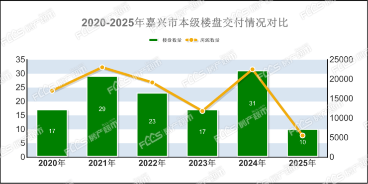 对比过往数据,这一规模显著收缩:2024年嘉兴市本级交付楼盘超30个,房源量更是突破23000套;2023年、2022年交付楼盘数也分别达到17个、23个。从数据可见,受土地供应节奏影响,2025年交付楼盘数与房源量均为近五年最低。