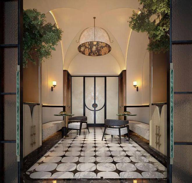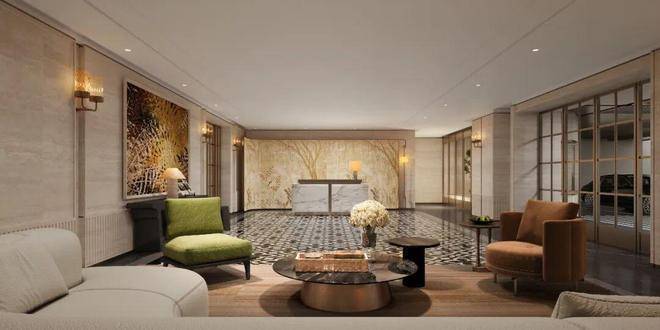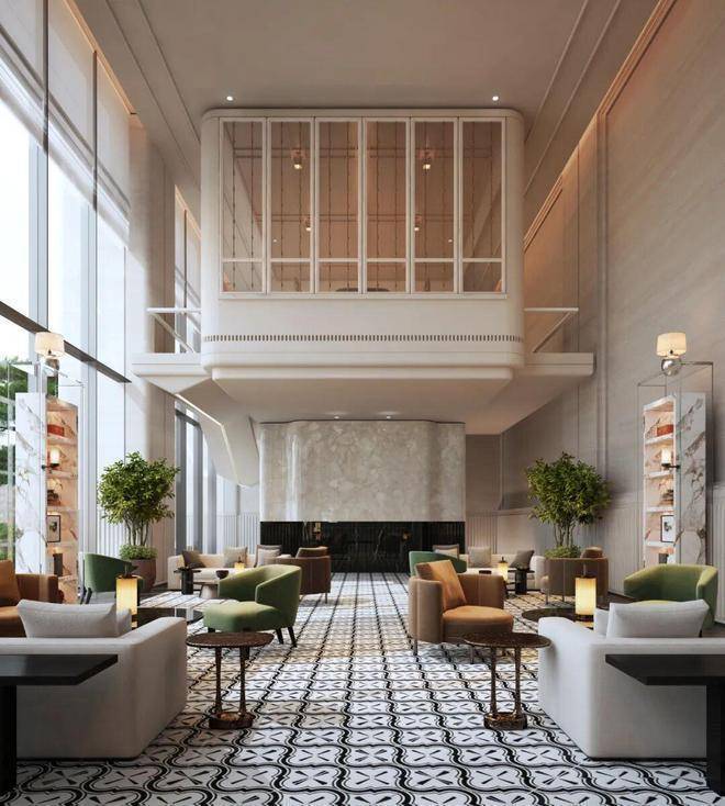 挑高约8.2米的一楼大堂,单层建筑面积约340平方米,尺度对标香港瑰丽酒店。